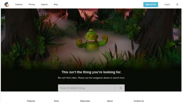 Mailchimp是一個非常流行的電子郵箱營銷平臺。在它的404錯誤頁面,Mail Chimp使用了一張猩猩在森林中的背景圖片,似乎在暗示訪客已經(jīng)迷路了。進入這個頁面的訪客可以在插圖的幫助下更加清晰地明白它的信息。*棒的地方在于Mail Chimp在頁面的下方提供了一個搜索框,訪客可以在這搜索任何自己感興趣的內容。如果搜索框在查找或定位資源方面還不夠給力的話,訪客還可以使用搜索框下方的導航菜單。