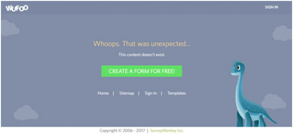 Wufoo是一個幫助人們在線創(chuàng)建獨特表格的網(wǎng)站。在Wufoo的404錯誤頁面上,綠色的按鈕(免費創(chuàng)建表格)很是顯眼,背景圖片中還有這一只恐龍正在直勾勾的盯著行為引導按鈕,這無形之中又給了訪客暗示,訪客更有可能點擊這個按鈕。除此以外,Wufoo還將可選的菜單項放在了行為引導按鈕的下方,給訪客提供多種選擇。