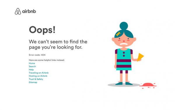 雖然訪客在404頁面沒有及時獲取想要的內容,但這并不是瀏覽體驗的終點。在訪客走進死胡同時,我們可以給他們以指引,在404頁面提供一些相關內容的鏈接,就像下圖Airbnb在404頁面放置了"主頁"、"幫助"、"查找"等諸多選項,讓用戶有"柳暗花明又一村"的感覺。沒準,用戶能在其他頁面找到自己想要的信息,又或是對某個頁面產(chǎn)生興趣,從而在網(wǎng)站上停留更長時間,這不就是我們想要達成的目的嗎?