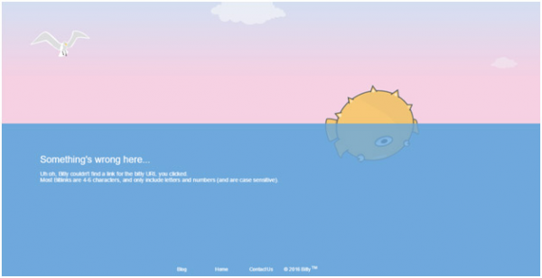 Bitly是一家提供縮短URL服務的網(wǎng)站。下圖就是它的404錯誤頁面,很美觀,也富有深意。如果你仔細觀察一下它的錯誤頁面,你會發(fā)現(xiàn)設計師將海洋設計成空無一物的,這其實是在暗示網(wǎng)頁里什么都沒有,能給訪客提供一個更加直觀的感受:在這沒有想要的資源。Bitly同樣也在頁面的底部放置了導航菜單。另外,為了讓網(wǎng)站上的各種元素更具有互動性,Bitly的設計團隊還將海洋設計了波浪的動效,海鷗也是可以揮動翅膀的,你可以來這個網(wǎng)站親自感受一下。