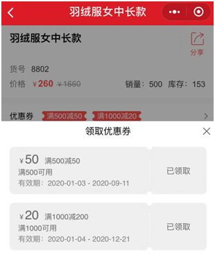 去庫(kù)存賣貨少不了營(yíng)銷活動(dòng),活動(dòng)推廣就需要預(yù)熱,讓用戶提前知道。我們可通過(guò)把商品或小程序店鋪海報(bào)分享到社群、微信朋友圈、群發(fā)好友等通知用戶,用戶點(diǎn)擊即可進(jìn)入小程序商城店鋪購(gòu)買促銷熱賣商品領(lǐng)取優(yōu)惠券。